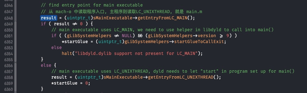 getEntryFromLC_MAIN,就是从``Load Command中读取LC_MAIN入口,如果没有,就读取LC_UNIXTHREAD,然后跳到入口处执行,就回到了我们熟悉的main.m`.