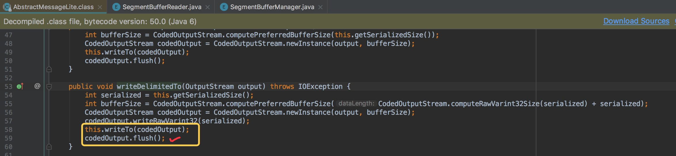 AbstractMessageLite#writeDelimitedTo(OutputStream)方法,将 TraceSegment 写入 Data 文件。该方法包括 flush 操作,代码如下: