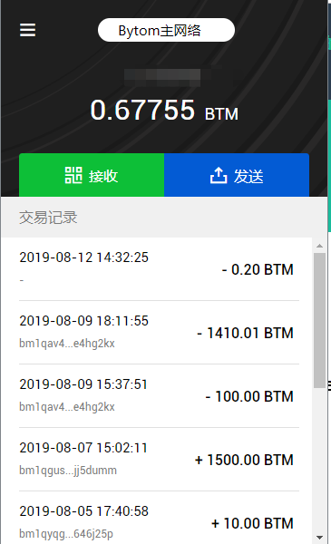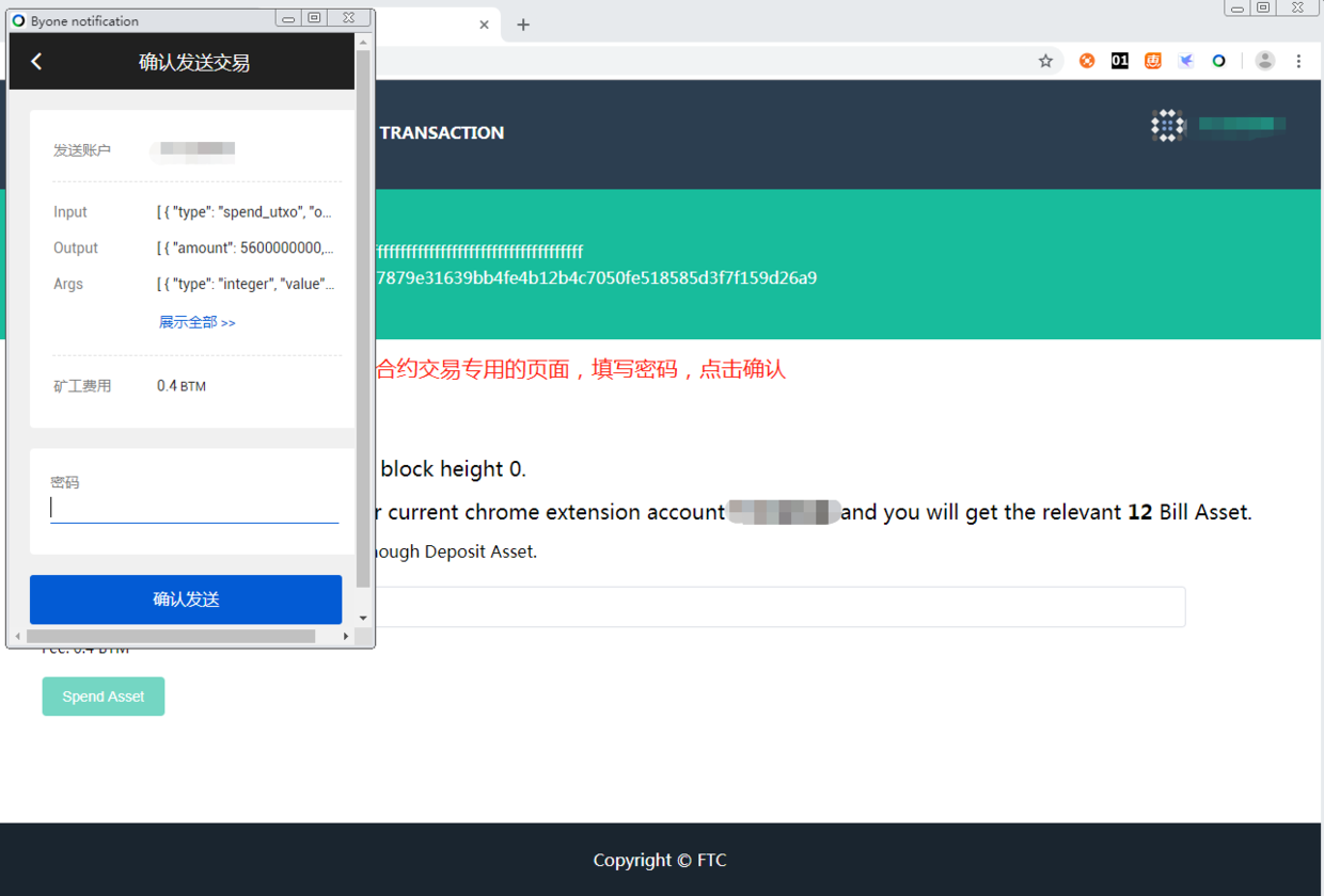 4)执行window.bytom.send_advanced_transaction方法,参考插件钱包API,是高级交易方法,这个是bycoin插件的原生方法,调起 提交交易的页面,让用户输入密码;