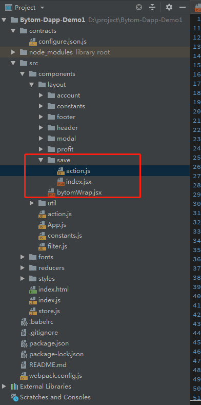 前端代码是基于前端框架react去做的,很容易读懂,结构如上,我们来看看作为储蓄页面(saving)Bytom-Dapp-Demo1\src\components\layout\save\index.jsx