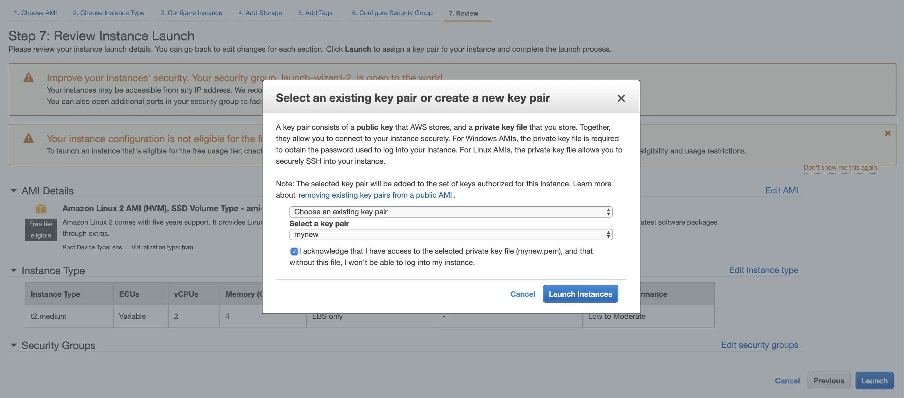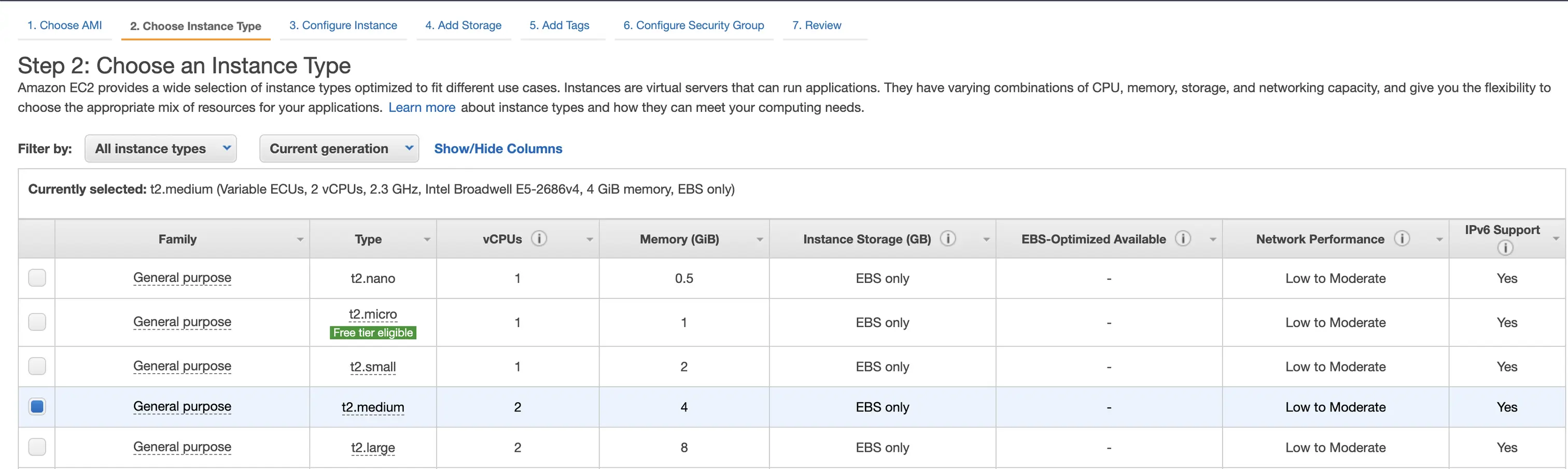 选择实例类型(我们将使用t2.medium)