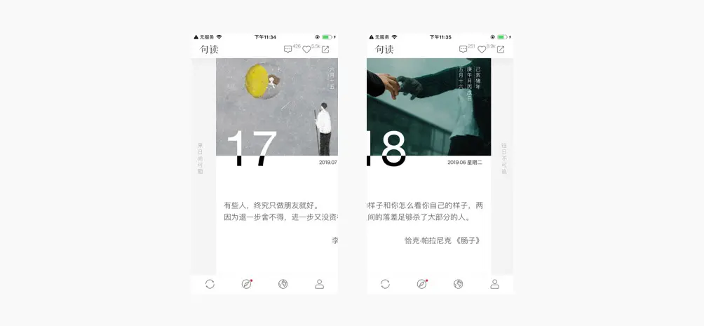 例如句读应用中,主要操作方式是左右横滑切换卡片,当用户翻到第一张或者最后一张卡片后,继续滑动页面,此时页面后露出的提示文案,并不是简单的“已是第一张”“已是最后一张”这种针对现象直观描述的文案,而是用了“来日尚可期”“往日不可追”两条文案。