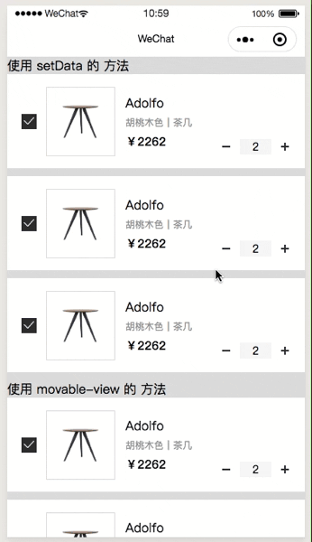 传统的小程序左滑做法是利用touchmove来实时的更新滑动的距离,这让小程序在性能上大打折扣,而且还时常出现卡顿不流畅的现象,小程序新出的movable-area + movable-view 可以完美的解决这个问题。 话不多说,直接上地址:源码地址