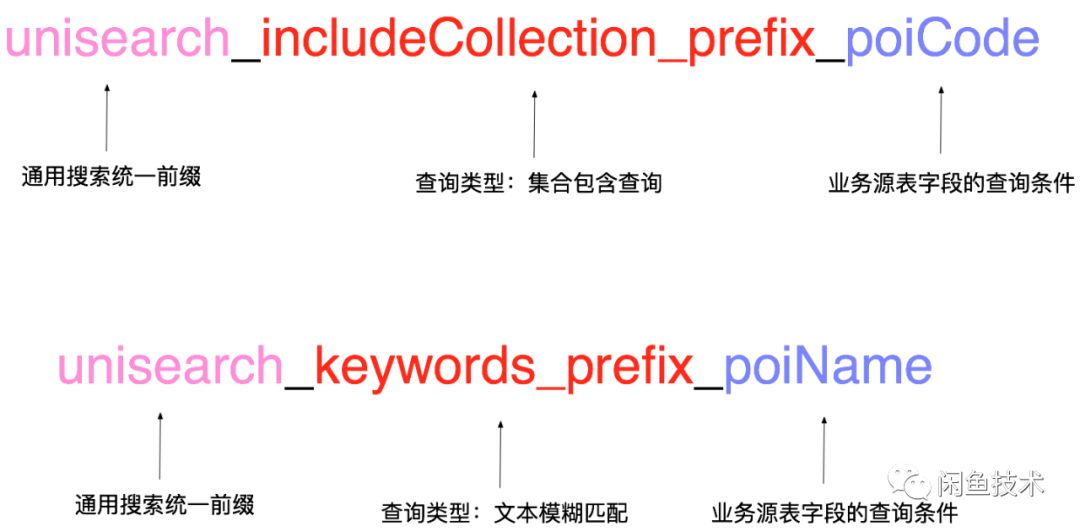 我们的方案是,当用户在元数据注册中心曾经接入一个新业务后,后台自动化生成生成为业务定制的二方包代码,其中包含了查询入参、返回DO、查询服务接口。还是以poi数据接入为例,poi业务域的开发同学在元数据注册中心说明了他需要按照poiname做文本模糊匹配,需要根据poicode做包含查询、不包含的精确查询。根据此登记信息,我们为用户自动生成poi业务场景专用的查询服务入参,每个入参都是一定的规则拼接而成,网关在线服务拿到此参数后可以根据命名规则翻译成具体的查询串。参数命名规则如下图