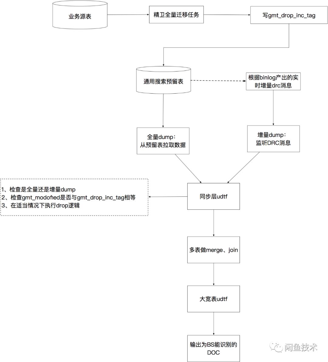 3. 在引擎原生dump层,我们在每一张通用搜索预留表与后续merge节点之间增加一层udtf逻辑代码。这里的udtf代码是dump层对外开放的一个口子,允许引擎接入方在dump流程上对数据做一些特殊处理,每一条上游的数据都会经过udtf的逻辑处理后再输出到下游进行merge、join、输出给BS系统。 我们在这里实现的逻辑是,如果识别到当前是全量dump流程,则把当前流入数据的gmtdropinctag置为空,然后向下游输出;若识别到当前是增量dump流程,则检查当前流入的数据其gmtmodofied字段与gmtdropinctag字段是否相同,若两字段相同则对此数据执行drop逻辑,若两字段不同则把当前流入数据的gmtdropinc_tag置为空后向下游输出。 所有被执行了drop逻辑的数据都会被dump系统丢弃,不会输出到最终产出的数据文件中。