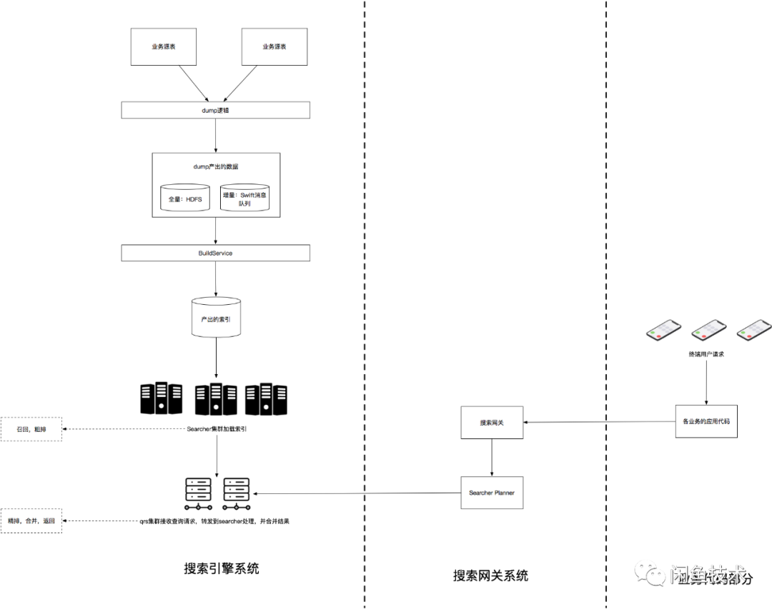 1. dump:接入搜索系统首先要做的就是把DB数据经过一些业务逻辑转换后(后面会详细描述的merge、join流程),按照引擎BuildService能够识别的文件格式写入到文件系统或者消息队列中供BS构建索引使用,这个过程分为全量与增量两种。