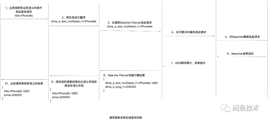 但是现在字段没了语义,他们开发的复杂度大大提升,甚至时间一长会陷入难以维护的境地,因为业务代码写完1个月后没人会再记得代码中的“param.setDimaALongR1(1234567L)”是什么意思,这是按照用户id还是商品id查询?虽然底层我们是将多个业务的数据放在一个引擎服务中,但是我们希望提供给业务开发同学(也就是我们这套系统的用户)的在线查询服务与独立搭建一套引擎的体验是一样的。 所以,这里就需要有一个翻译层,通用搜索系统接收到的查询请求是“title=iPhone6S”,我们需要根据元数据注册中心的映射关系自动翻译成“dimaatextmultilevelr1=iPhone6S”后再向引擎发起搜索请求,并把引擎返回的数据DO中无语义字段翻译成源表的有语义字段。