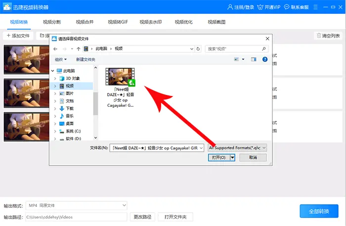 1、首先打开迅捷视频转换器,然后点击软件左上角的添加文件或者点击添加文件夹按钮,然后选择准备好的MP4视频文件并且打开即可将其添加到软件中,或者选择需要转换的视频然后拖动到软件中,