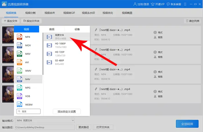 3、然后就需要设置转换之后输出视频的格式了,在软件下方输出格式中选择视频的格式为M4V格式,而分辨率最好默认选择同原文件的原视频分辨率,如果修改了,视频清晰度可能会下降变模糊,软件默认输出格式为MP4格式,