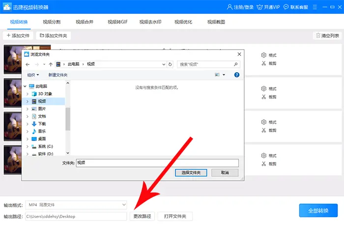 2、MP4视频添加后,需要设置转换之后输出视频的保存位置,初始软件会保存在C:\Users\Videos,但是可以将其修改保存在桌面上,点击更改路径即可修改,或者将C:\Users\Desktop输入到地址栏中,