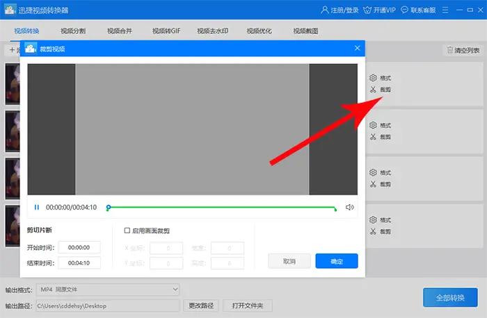 5、以上参数都设置完成后可以直接转换视频格式,但是考虑到很多人可以需要剪切视频,将视频剪短。那么可以点击视频文件后面的裁剪按钮,然后进入裁剪面板中,在里面选择视频的开始和结束时间,然后就可以确定,