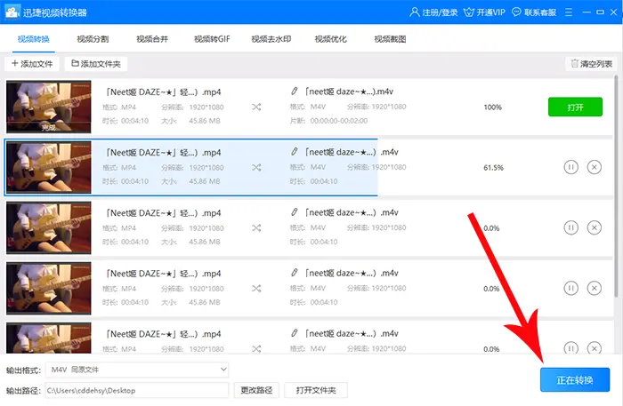6、最后全部设置完成后就可以点击软件右下角的全部转换按钮了,如果只是需要单独转换某个视频或者某些视频,可以点击单个文件后面的转换按钮,然后等待软件将MP4视频100%转换成M4V格式后就可以播放了,