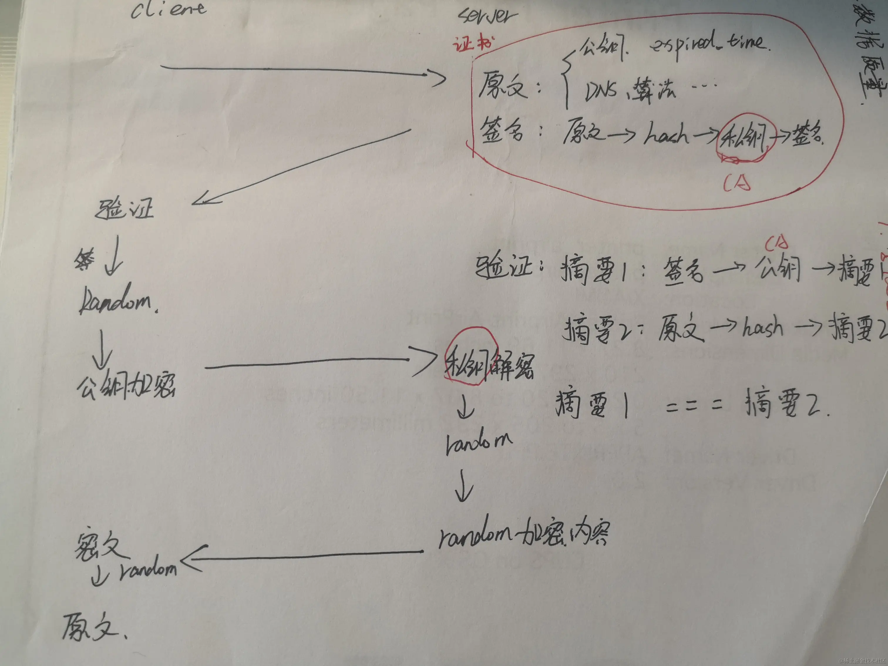 摘要1: 服务端: 原文 => hash算法 => 摘要1 => CA私钥加密 => 签名