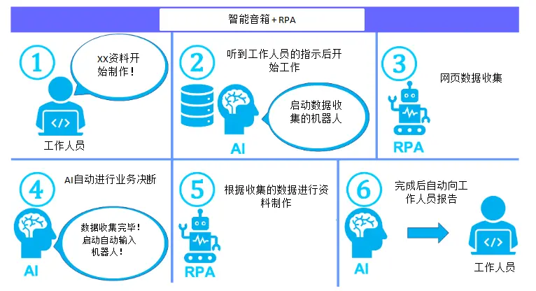 IPA可以做什么? 简单来说,就是由AI代替人脑去判断,并交给RPA去实现。比如: 一、RPA与智能音箱的结合 这就像是给软件机器人装了耳朵。 首先,工作人员通过语音给智能音箱发送工作指示,AI接收语音指示后对该工作进行判断分析,并启动RPA机器人。RPA机器人按照智能语音的提示进行资料和信息的收集并完成工作,最后把完成的资料交给AI判断,最后报告给工作人员。
