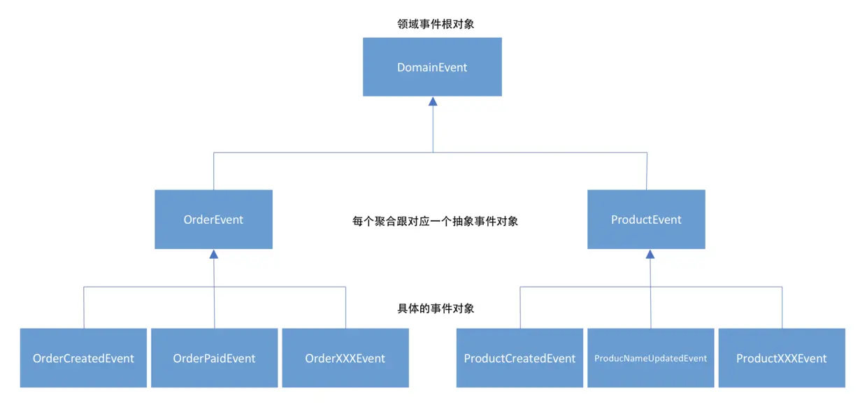 在DDD场景下,领域事件一般随着聚合根状态的更新而产生,另外,在事件的消费方,有时我们希望监听发生在某个聚合根下的所有事件,为此笔者建议为每一个聚合根对象创建相应的事件基类,其中包含聚合根的ID,比如对于订单(Order)类,创建OrderEvent: