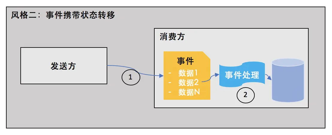 - 领域事件应该携带与事件发生时相关的上下文数据信息,但是并不是整个聚合根的状态数据,例如,在创建订单时可以携带订单的基本信息,而对于产品(Product)名称更新的