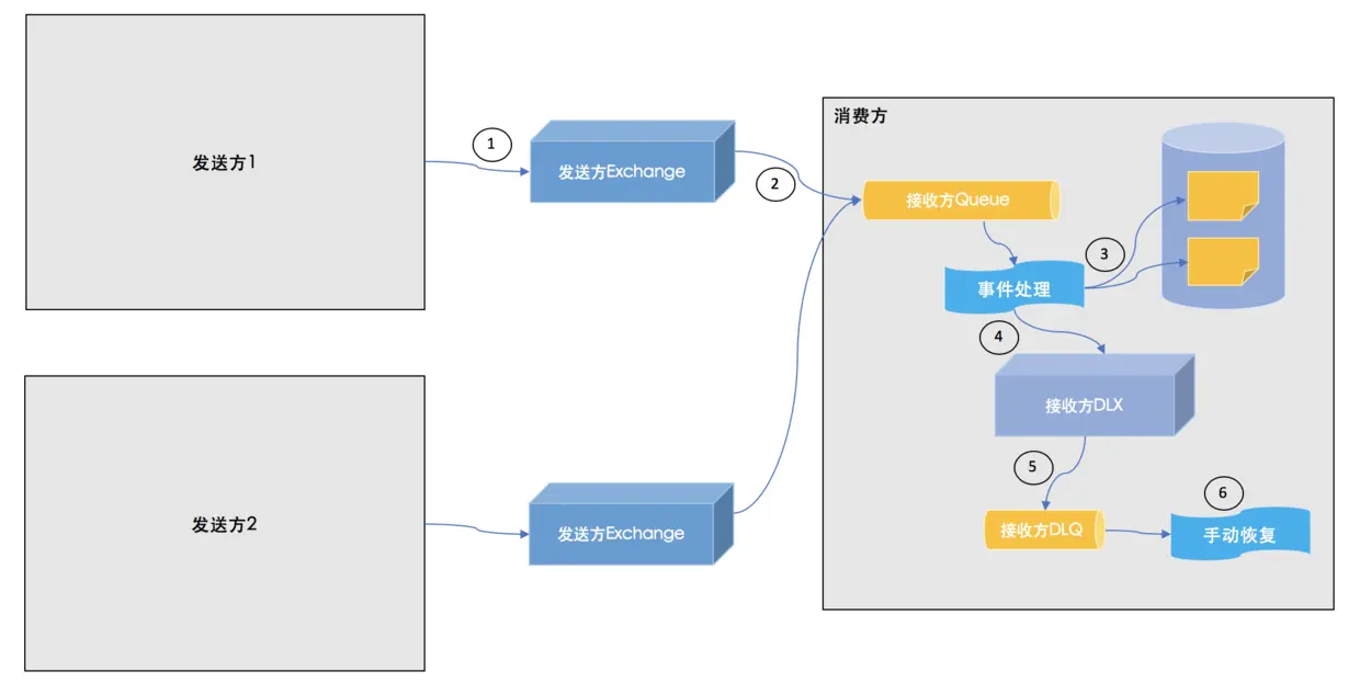 对于发送方而言,事件驱动架构提倡的是“发送后不管”机制,即发送方只需要保证事件成功发送即可,而不用关心是谁消费了该事件。因此在配置发送方的RabbitMQ时,可以简单到只配置一个发送方Exchange即可,该Exchange用于接收某个微服务中所有类型的事件。在消费方,首先配置一个接收方Queue用于接收来自所有发送方Exchange的所有类型的事件,除此之外对于消费失败的事件,需要发送到接收方DLX,进而发送到接收方DLQ中,对于接收方DLQ的事件,采用手动处理的形式恢复消费。
