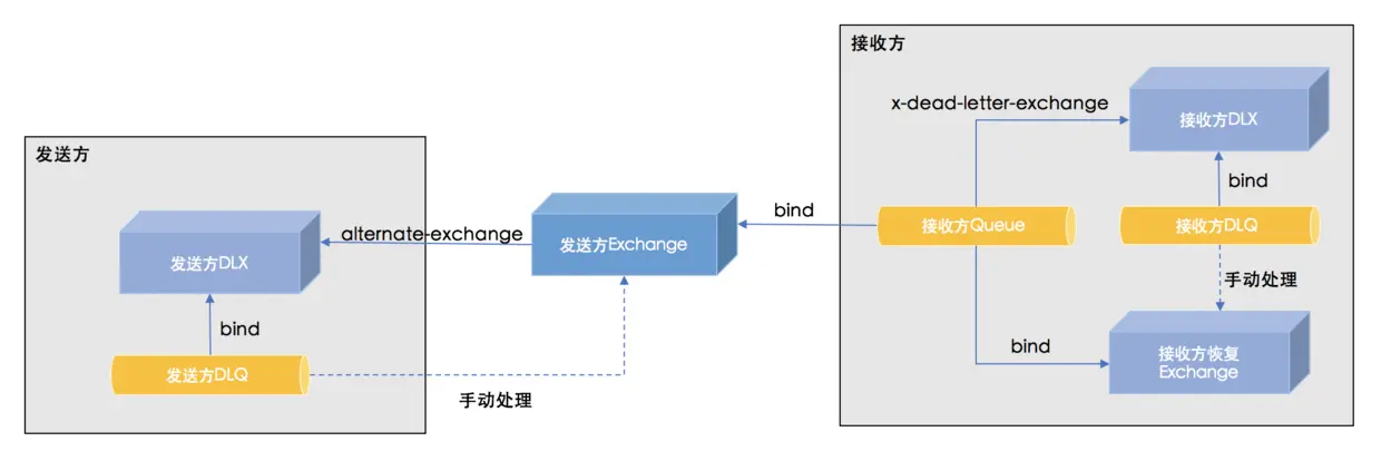 | 接收方DLQ | Queue | 死信队列,用于存放接收方DLX的消息 |