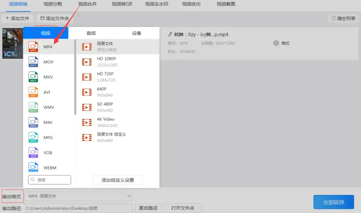 2、添加好视频后可以优先设置输出格式,而因为我们要把kux格式转换成mp4格式,因此要把输出的视频格式调整为mp4格式。