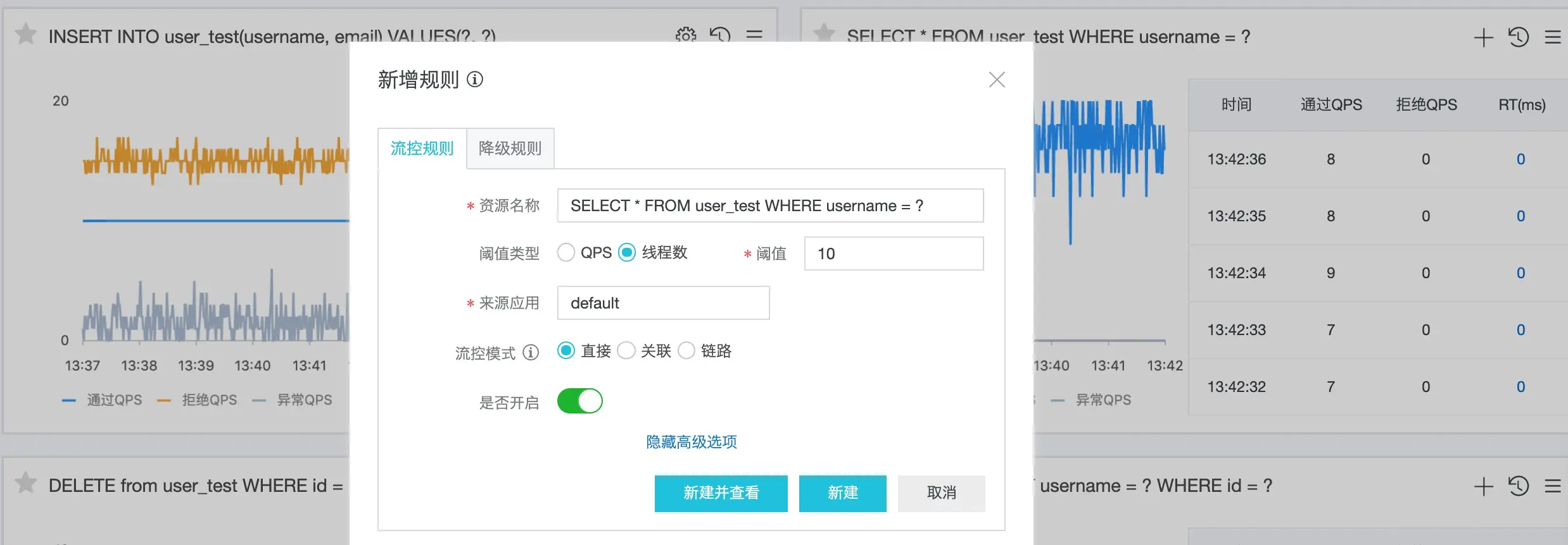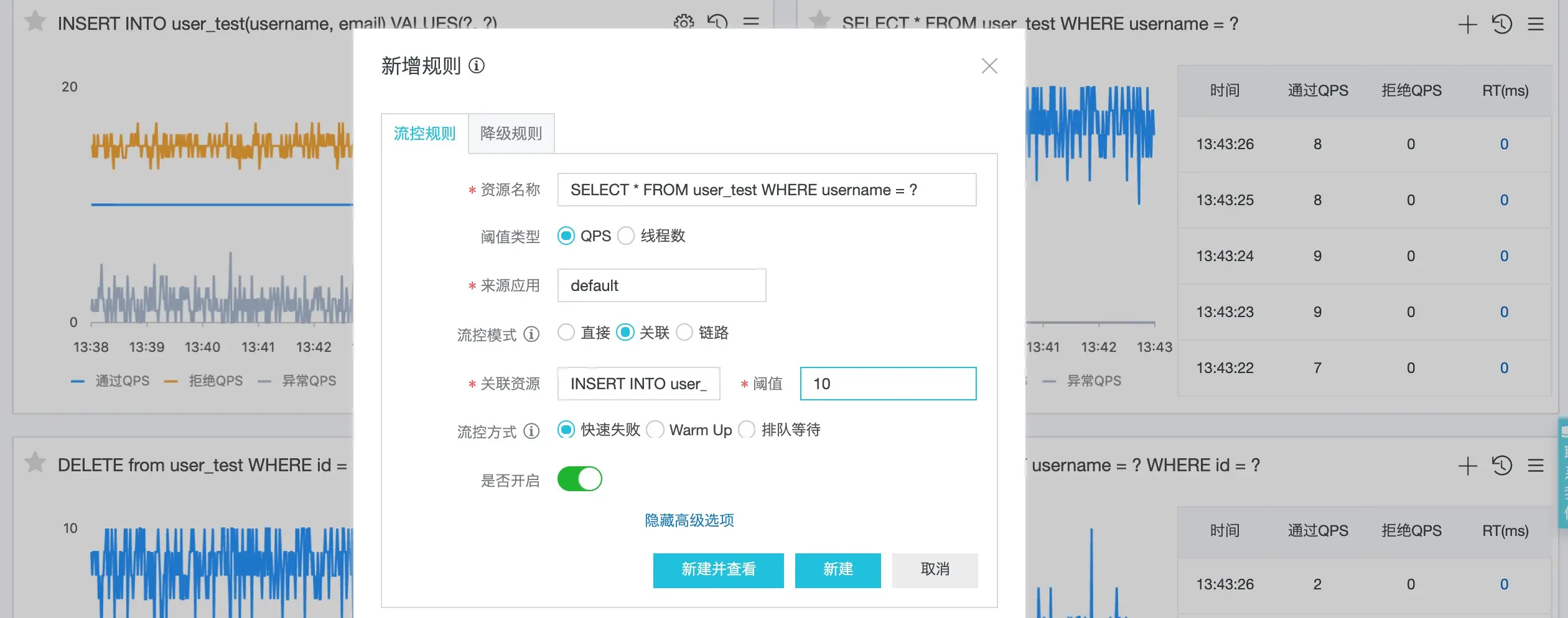 阈值配置为关联SQL资源,关联的资源请求超过设置的之后,该资源的调用将被拦截。可以根据需要将SQL读关联写资源。