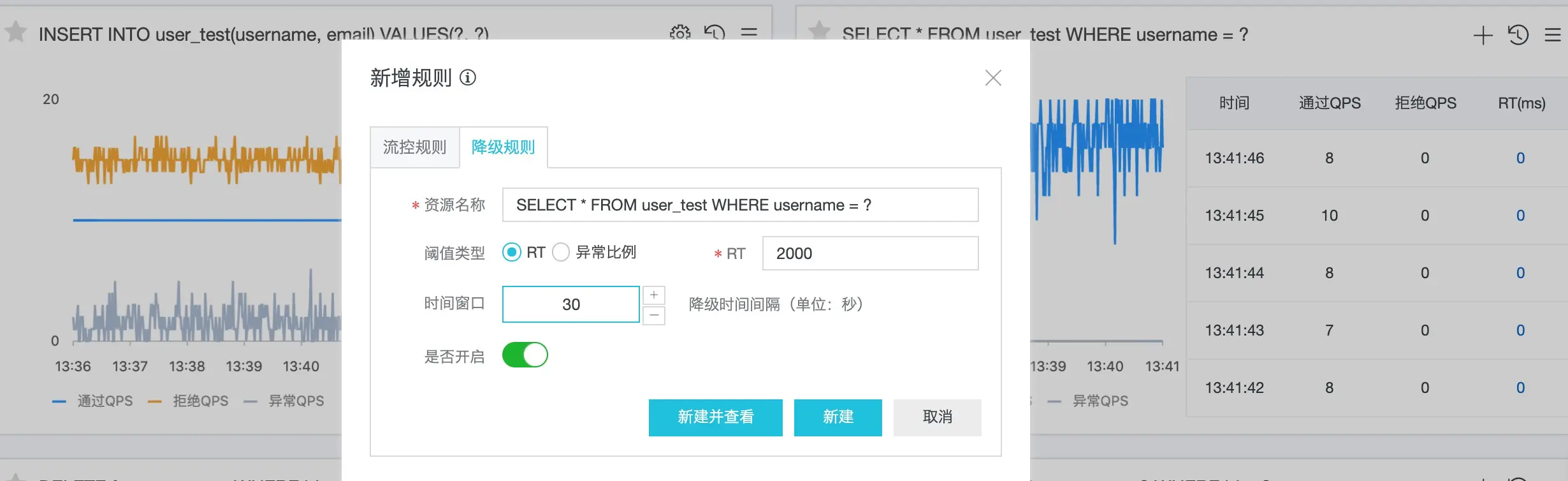 除了限流规则之外,AHAS还提供了基于RT和异常比例的降级策略。对于慢SQL防护,使用者可以根据SQL执行的RT设置对应的阈值以及时间窗口,超过指定的RT值后在时间窗口内 SQL 执行将被降级,抛出包装好的异常。