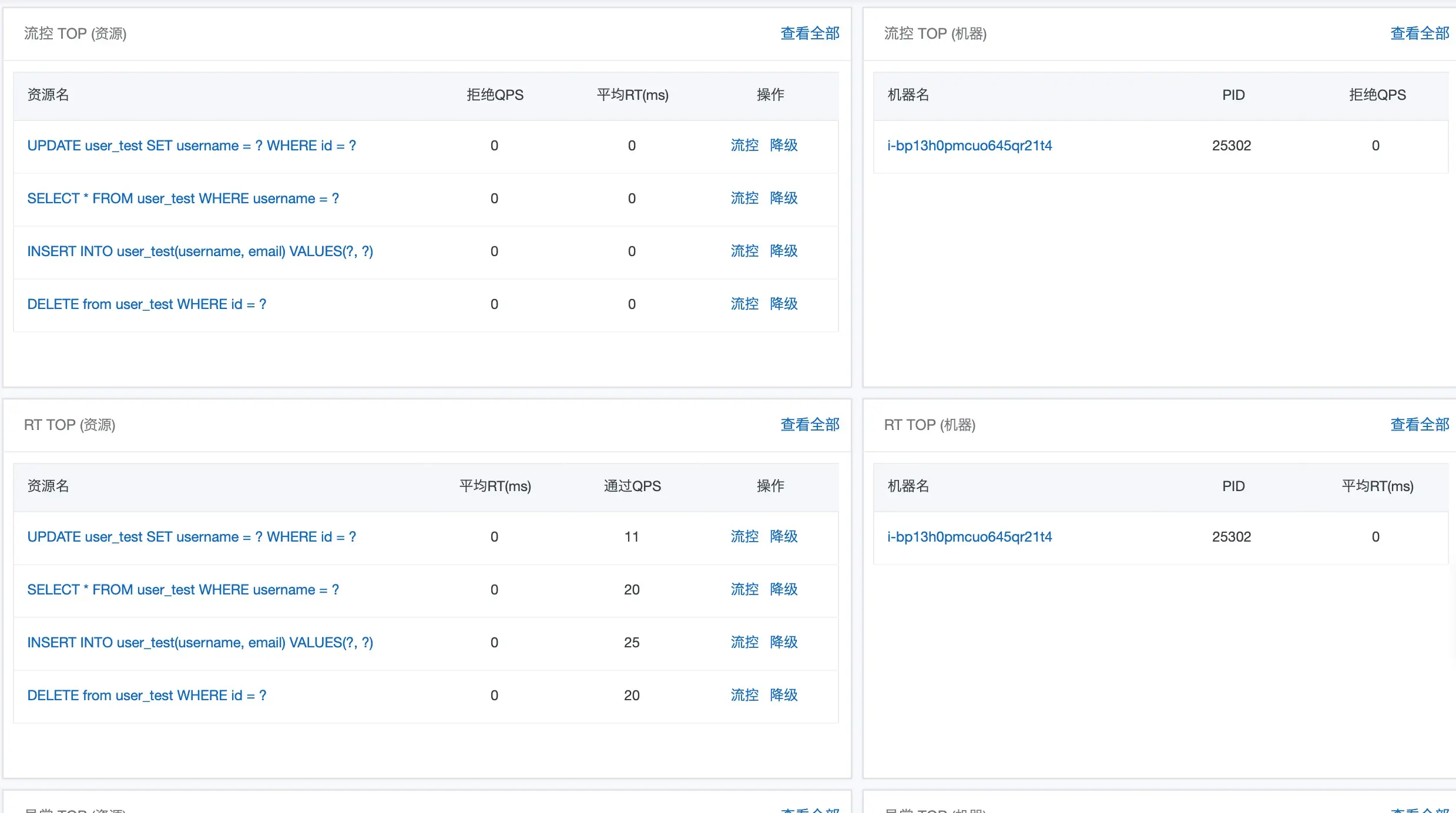 除此之外还能够很直观的看到不同 SQL 语句执行的 TOP 情况,包括请求 QPS TOP、拒绝 QPS TOP、RT TOP,以及对应的单机 TOP 数据: