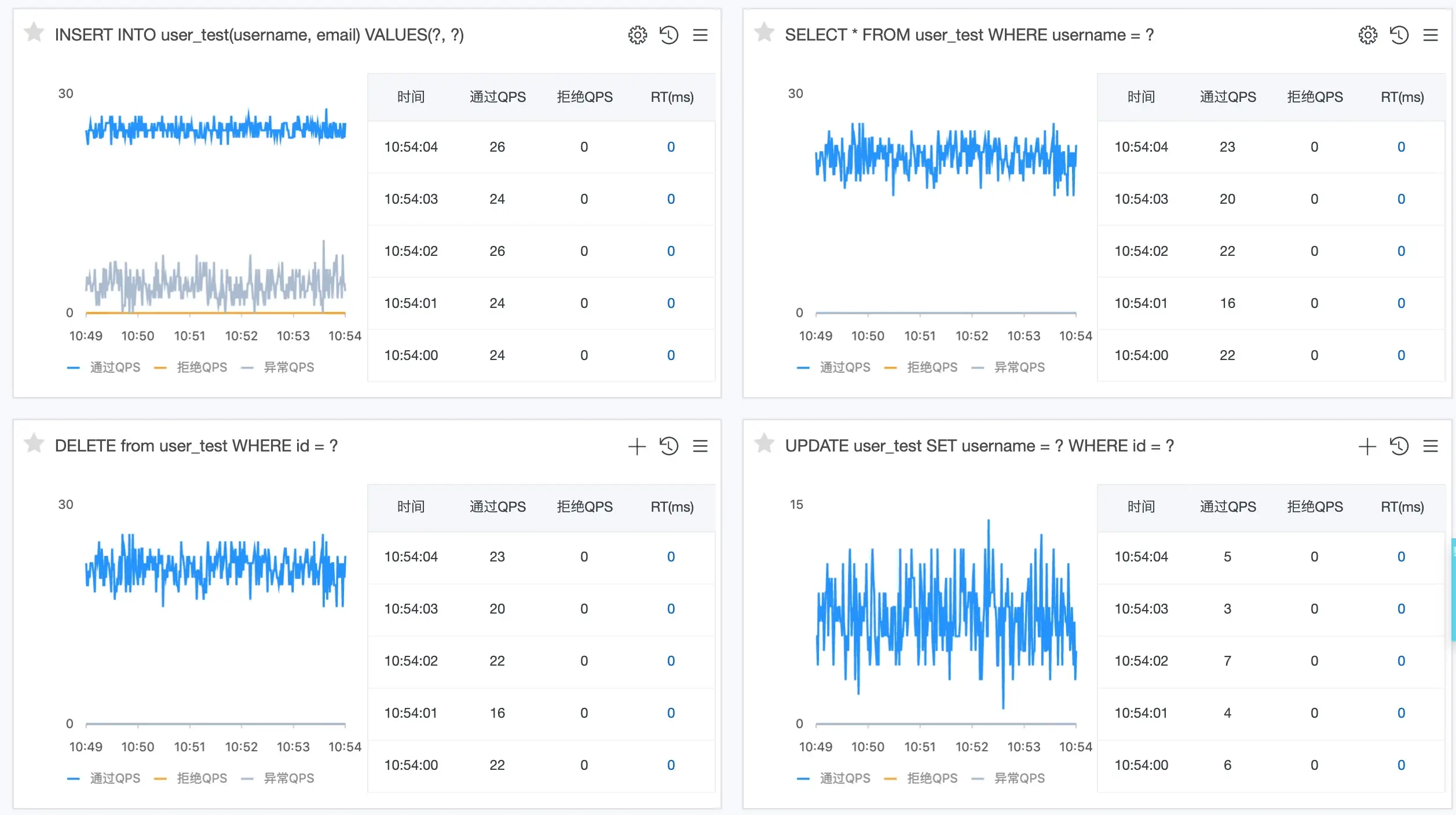 接入成功后就可以在AHAS控制台的监控页看到SQL资源调用的QPS以及RT等信息,用户可以在监控页面通过查看SQL对应的RT值来判断该SQL执行是否过慢,从而提前设置限流和降级规则进行多手段防护。对于SQL的常见防护规则我们会在慢SQL防护中详细说明。