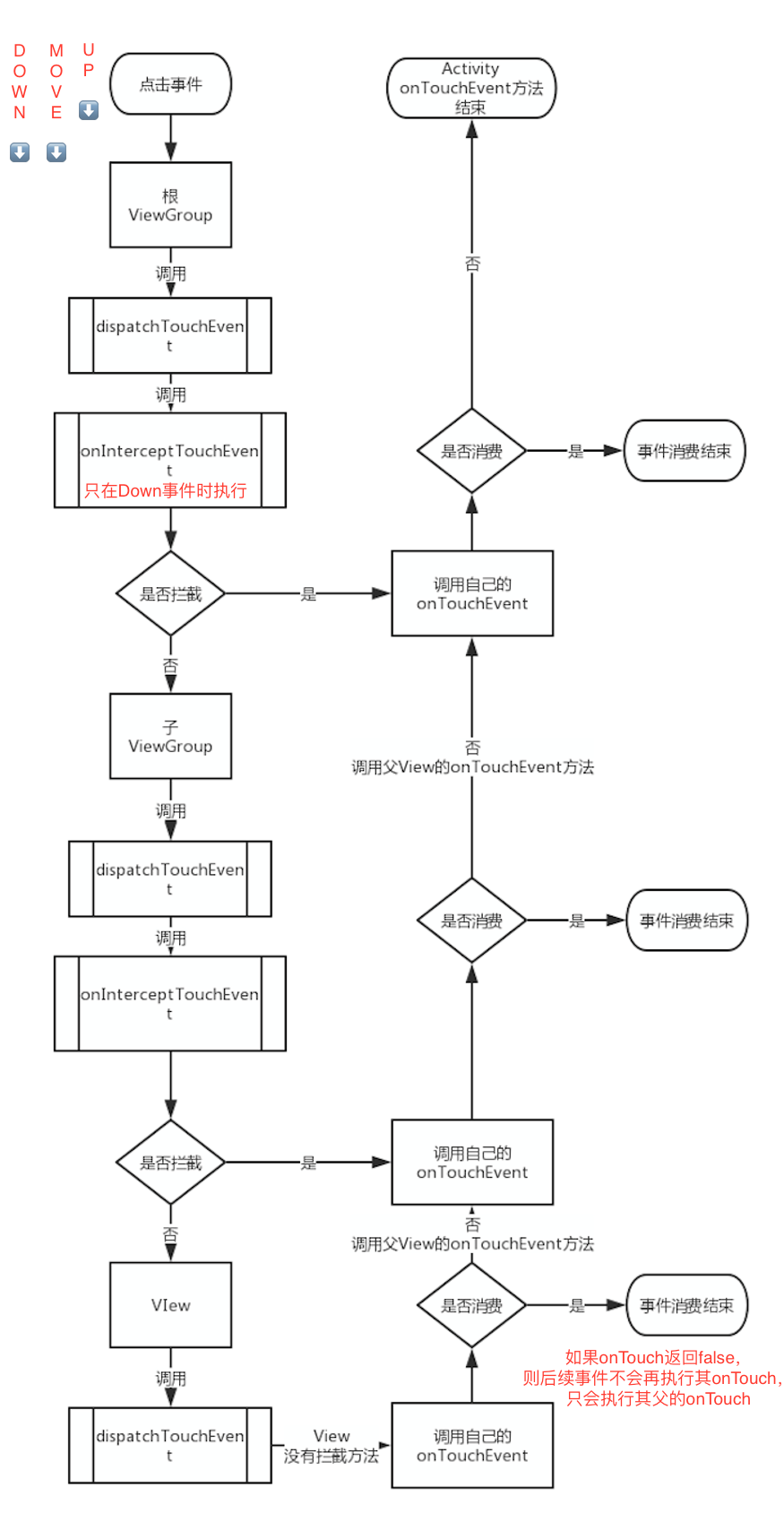 即onTouch中在哪消费的Down事件,则后续的MOVE、UP等事件,只会传递到该View,而不会再分发给其子View,所以也不会执行子View的dispatchTouchEvent。