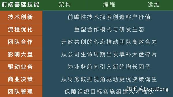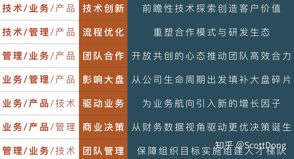 我把深水区的技能,更口语化的总结为: 技术创新、流程优化、团队合作、影响大盘、驱动业务、商业决策和团队管理,如下图: