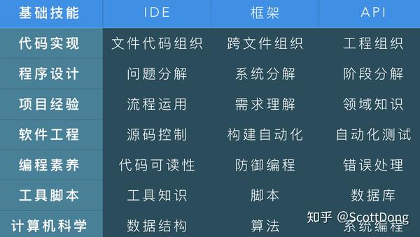站在 2019 年,通常一个工程师履历中体现的是跳槽历史、参与项目的难度、React/Vue/Angular 等框架底层熟悉度、编程方法论的掌握程度以及职位的变迁等,而在工作中的确与编程强相关的技能有很多(该图是我多年前整理修改而来,有同学知道出处可以告知我):