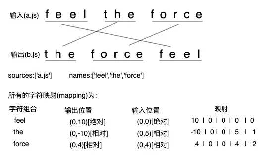 以the为例,它在输出中的位置是(0,0),a.js是sources的第1个(这里只是举例),输入中的位置是(0,5),the是names的第2个(这里只是举例)。