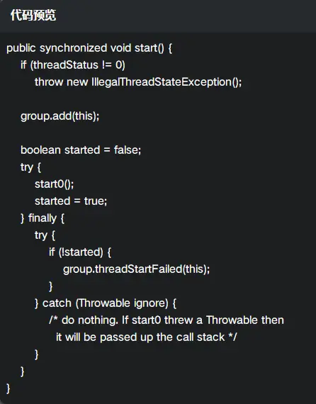 请注意,start() 方法被标识为 synchronized 的,即为了防止被多次启动的一个同步操作。