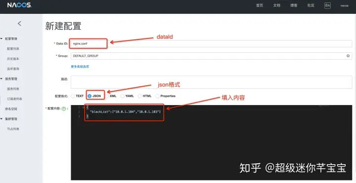 在 public 命名空间创建 dataId 为 nginx.conf 的配置文件,group 使用默认的 DEFAULT_GROUP 即可,配置内容为 json 格式