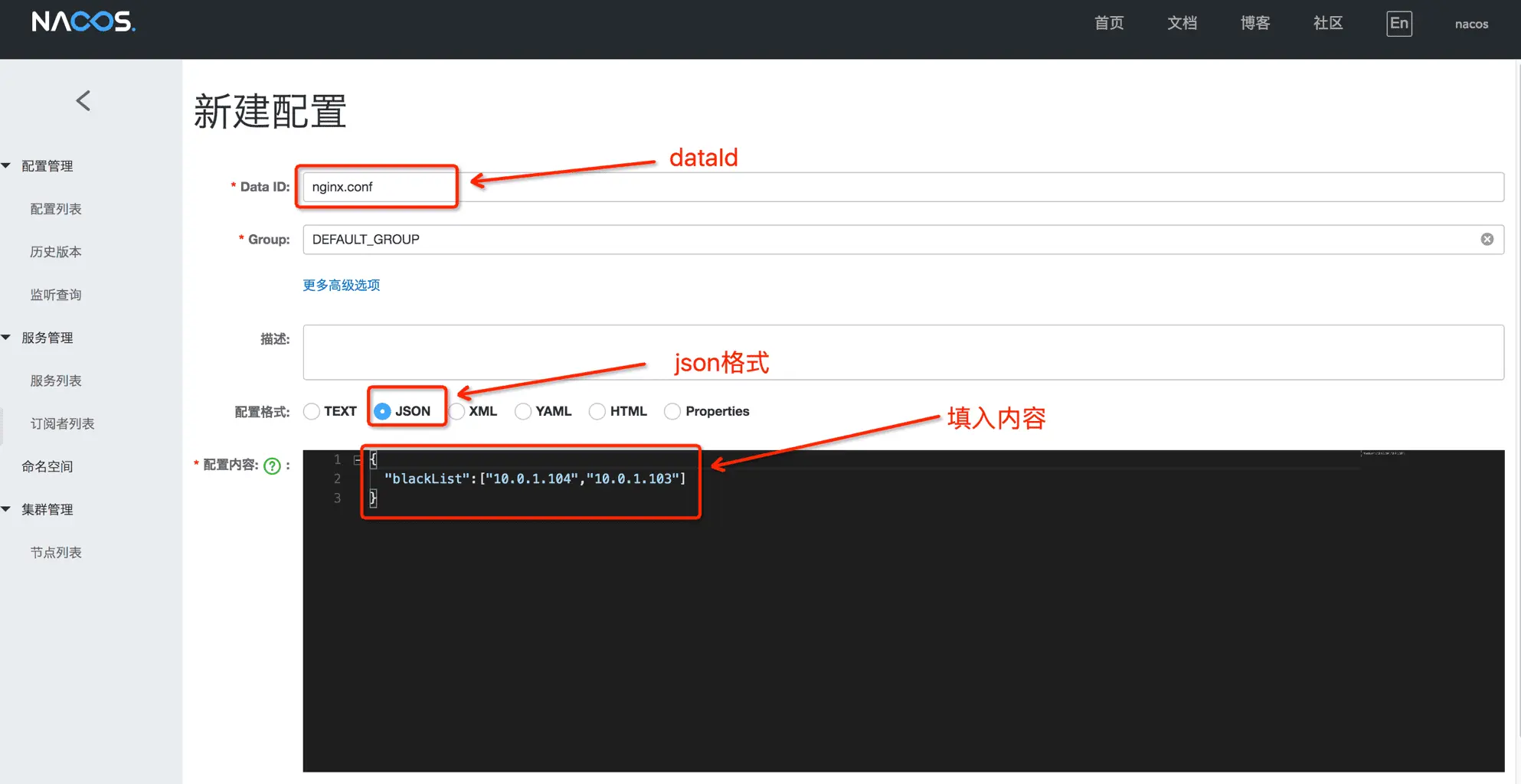 在 public 命名空间创建 dataId 为 nginx.conf 的配置文件,group 使用默认的 DEFAULT_GROUP 即可,配置内容为 json 格式