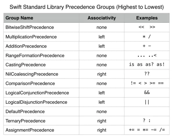 Swift中的所有运算符都属于一个优先级组,它描述了运算符的运算顺序。 还记得学习小学数学中的操作顺序吗? 这基本上就是你在这里所要处理的。 在Swift标准库中,优先顺序如下: