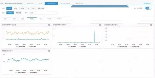 前面两种类型的监控已经基本可以定位到故障是否由于程序 Bug、上游应用或单机故障引起的,还有一类就是对中间件的监控,这里我们利用了 Sunfire 的基础监控对应用的 CPU、Load、JVM、HSF(Dubbo)、MetaQ 等中间件的各项指标进行监控。如果因为中间件故障,此处将会有明显的报警。