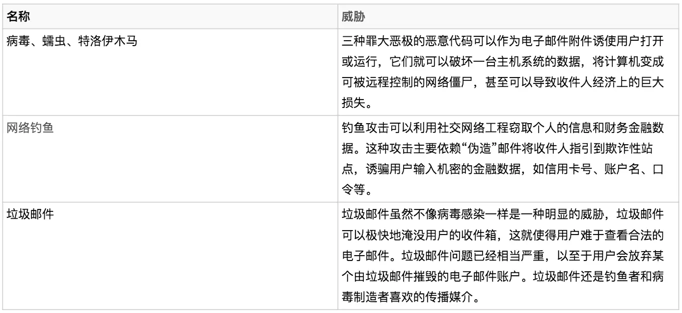 虽然电子邮件的安全经常被看作是一个独立的问题,实际上它是几种不同威胁的混合物,这些威胁都可以单独地破坏计算机及欺诈收件人,而且可以损害邮件的有效性、可靠性及人们对邮件系统的信任。电子邮件威胁可被分为几种不同的种类:
