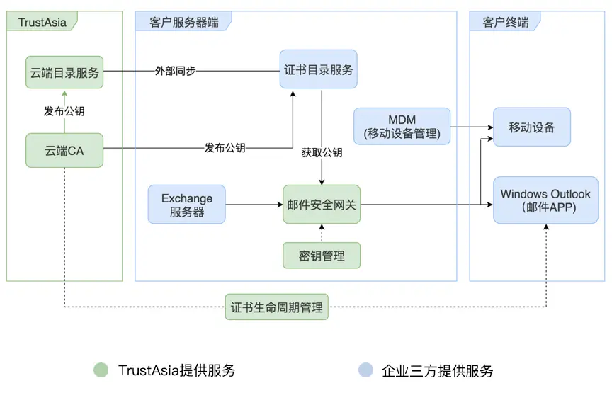 亚洲诚信(TrustAsia)提供基于S/MIME可信企业安全邮件解决方案,该方案提供独立LDAP共享公钥、可信CA云端实时服务、邮件安全网关无缝连接服务器、证书密钥自主管理及证书全生命周期管理五大功能模块,实现全程端到端的安全。