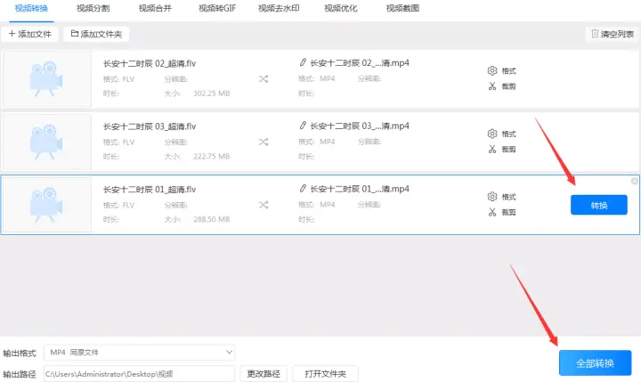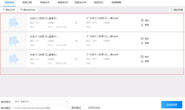 4、点击转换或全部转换按钮就可以把你在在线网站保存的flv格式转换成mp4了。转换的时候会出现一个进度条,当进度条到100%就表示格式已经转换好了。