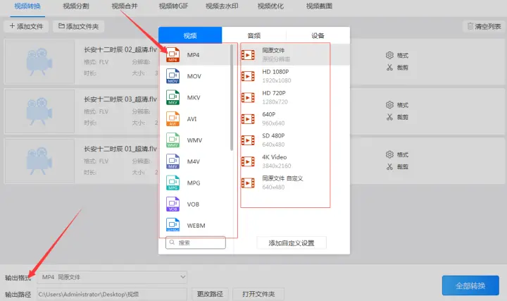 2、添加好视频后可以优先设置视频的输出格式,输出格式又分为输出的视频格式和视频分辨率,把输出的视频格式设置为mp4后分辨率可以根据需求调整参数。