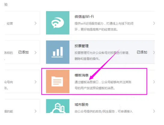 公众号模板消息申请在公众号后台功能->添加功能插件处看到申请模板消息功能的入口,但只有认证后的服务号才可以申请模板消息的使用权限并获得该权限。公众号可以拥有两个行业的模板,每个月可以更改一次所选行业。