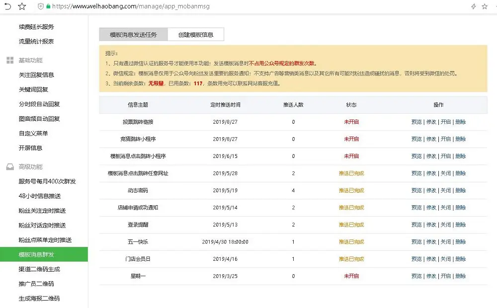 模版消息使用通过公众号功能插件平台微号帮可以发送,懂公众号接口开发的自己会写代码实现。微号帮平台模版消息群发支持粉丝点击消息跳转外部链接、小程序,模版消息支持文字改颜色。