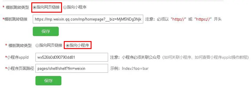 模板消息支持粉丝点击跳转外部链接、小程序,小程序必须与公众号关联绑定,外部链接和小程序路径都可以带参数。