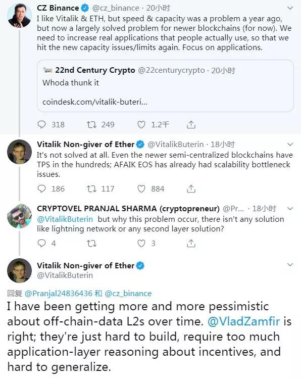 V神先是对赵长鹏的观点表示反对,他认为新的一批区块链项目根本没有解决可扩展性问题,即使是较新的半中心区块链也只有数百个TPS;AFALK、EOS已经存在可伸缩性瓶颈问题。