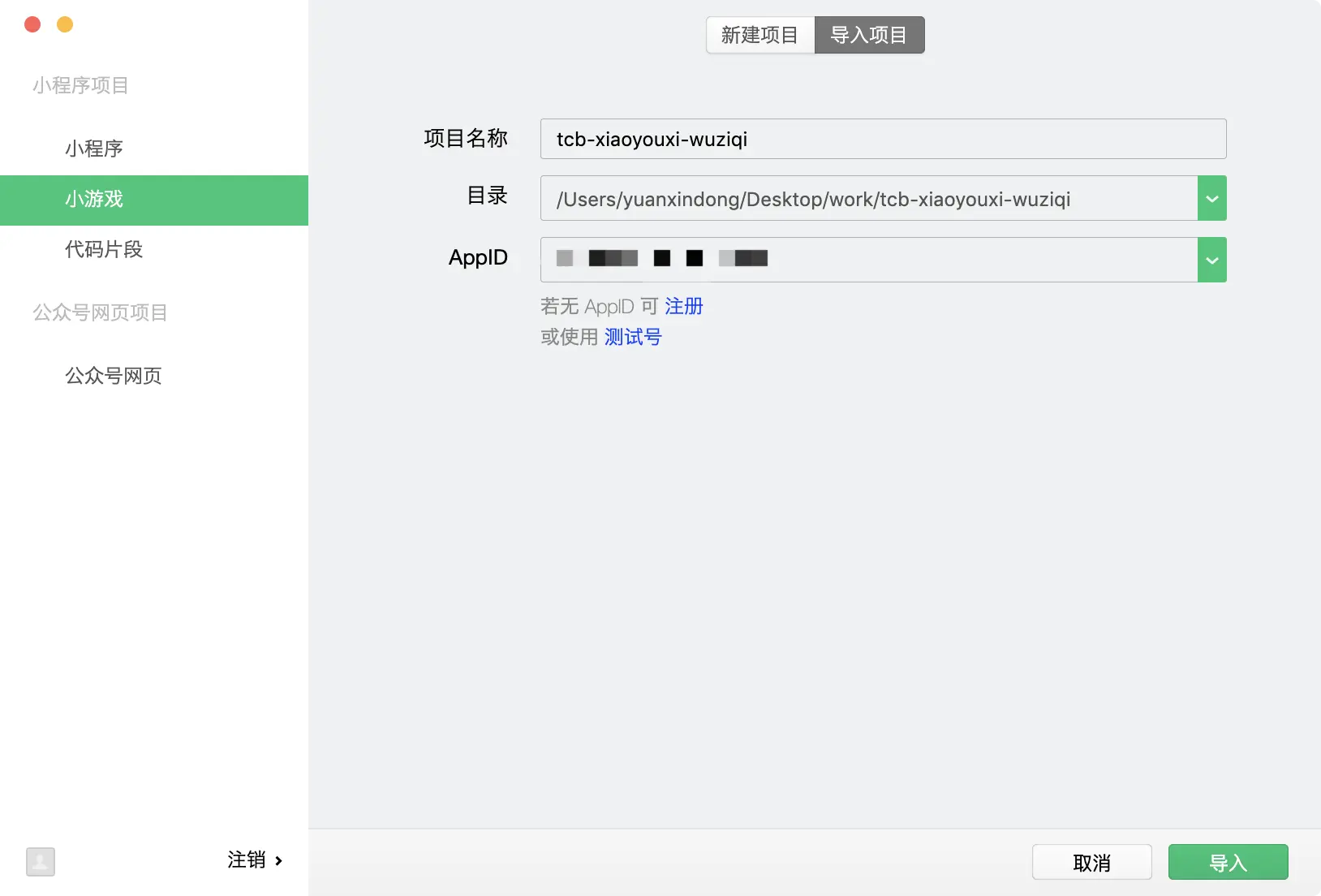 1、打开微信 IDE,点击左侧的小游戏,选择右侧的导入项目,导入之前下载的「在线对战五子棋」的目录,AppID 修改为你已经注册好的小游戏 AppID。