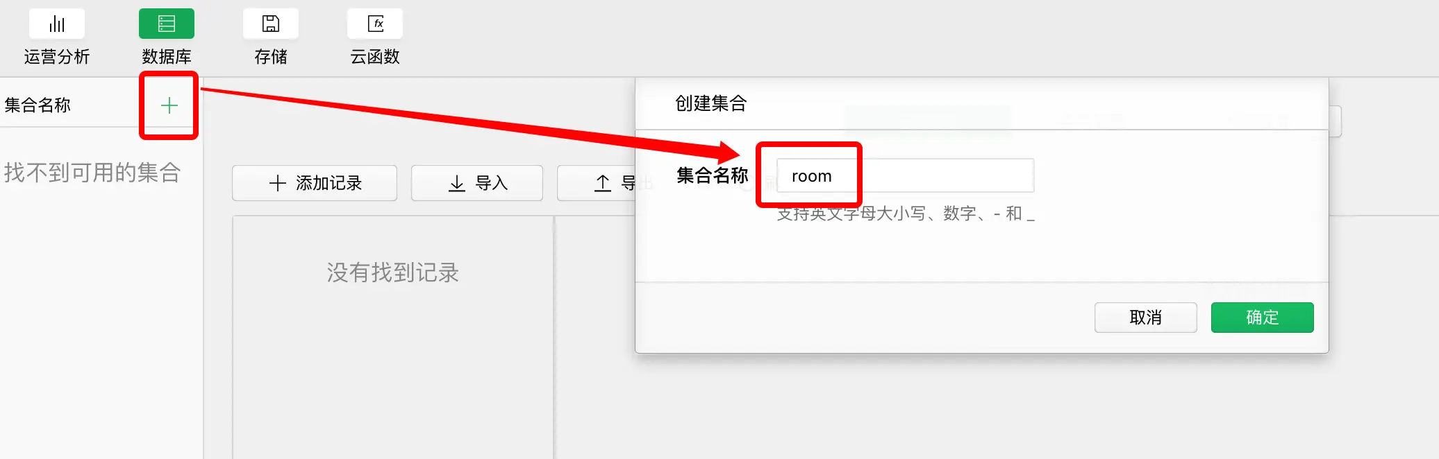 3、进入「云开发/数据库」,创建新的集合,新集合的名称是rooms。