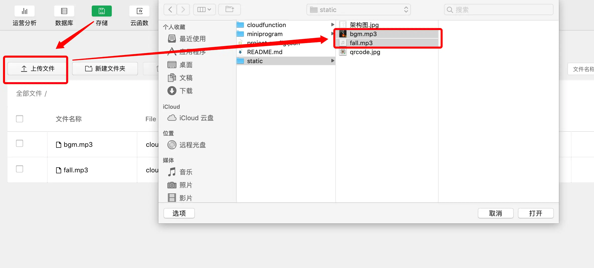 4、进入「云开发/存储」,点击“上传文件”。上传的内容是/static/下的bgm.mp3 和 fall.mp3。之后的代码中会通过云存储的接口,请求文件的临时 url,这样做的目的是减少用户首次进入游戏加载的静态资源。