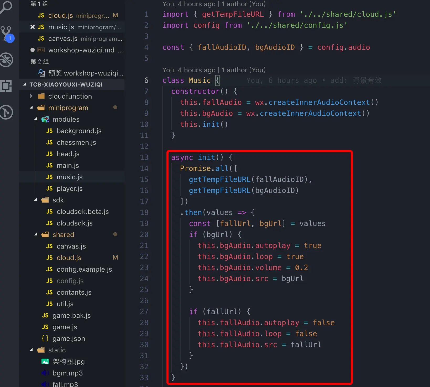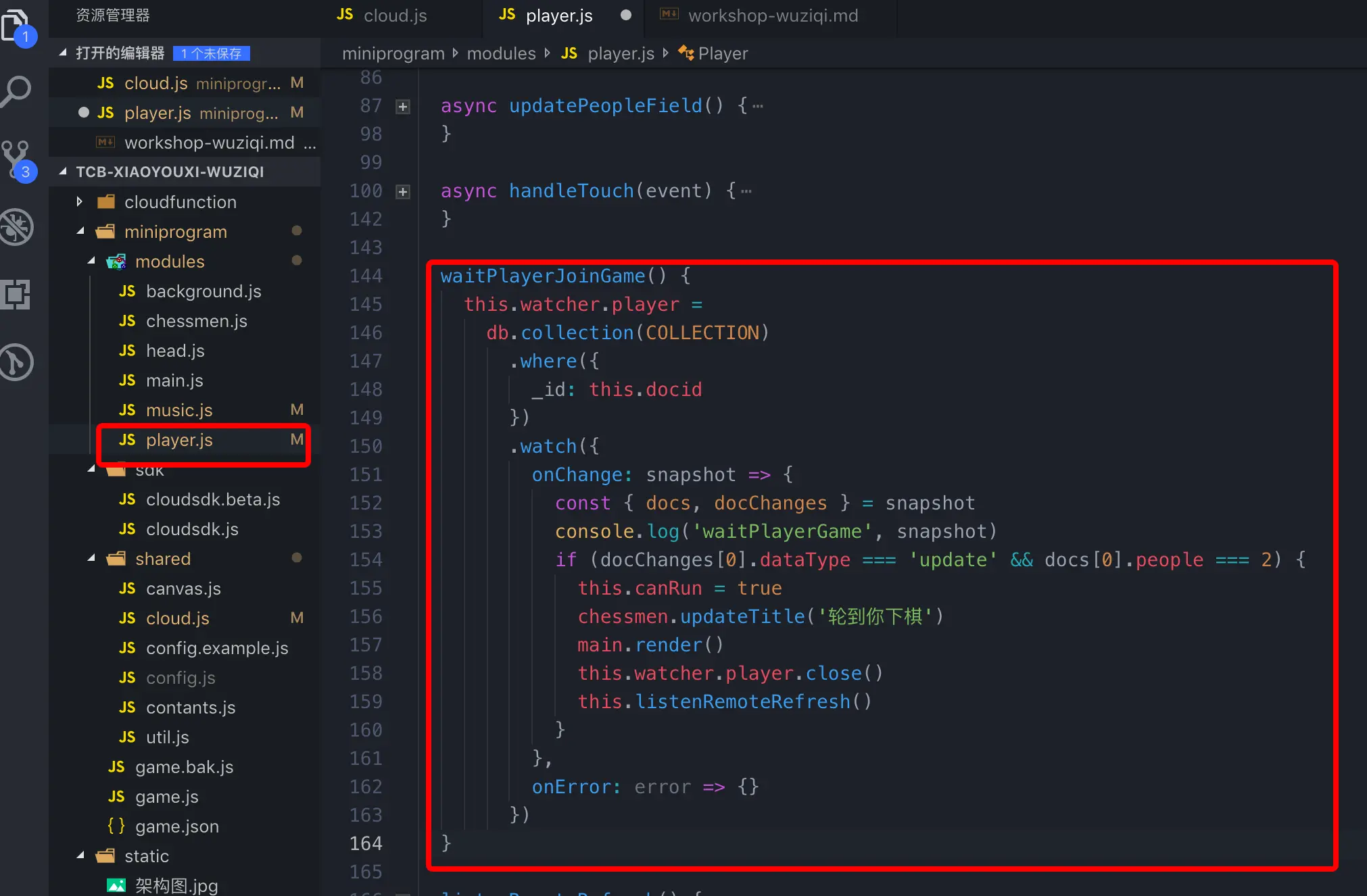 打开 miniprogram/shared/cloud.js,在里面初始化云开发能力,并且对外暴露云数据库以及聚合搜索的 API。