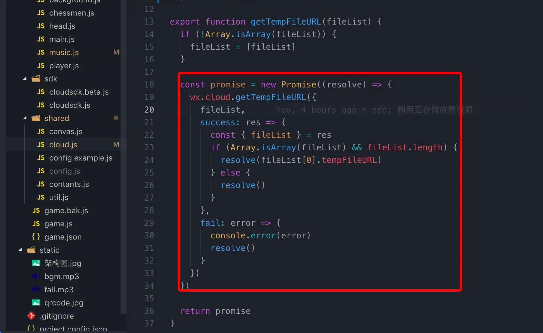 getTempFileURL函数属于云开发相关,因此放在了 miniprogram/shared/cloud.js中。这里只需要临时链接tempFileURL属性,其它返回值直接过滤调即可。