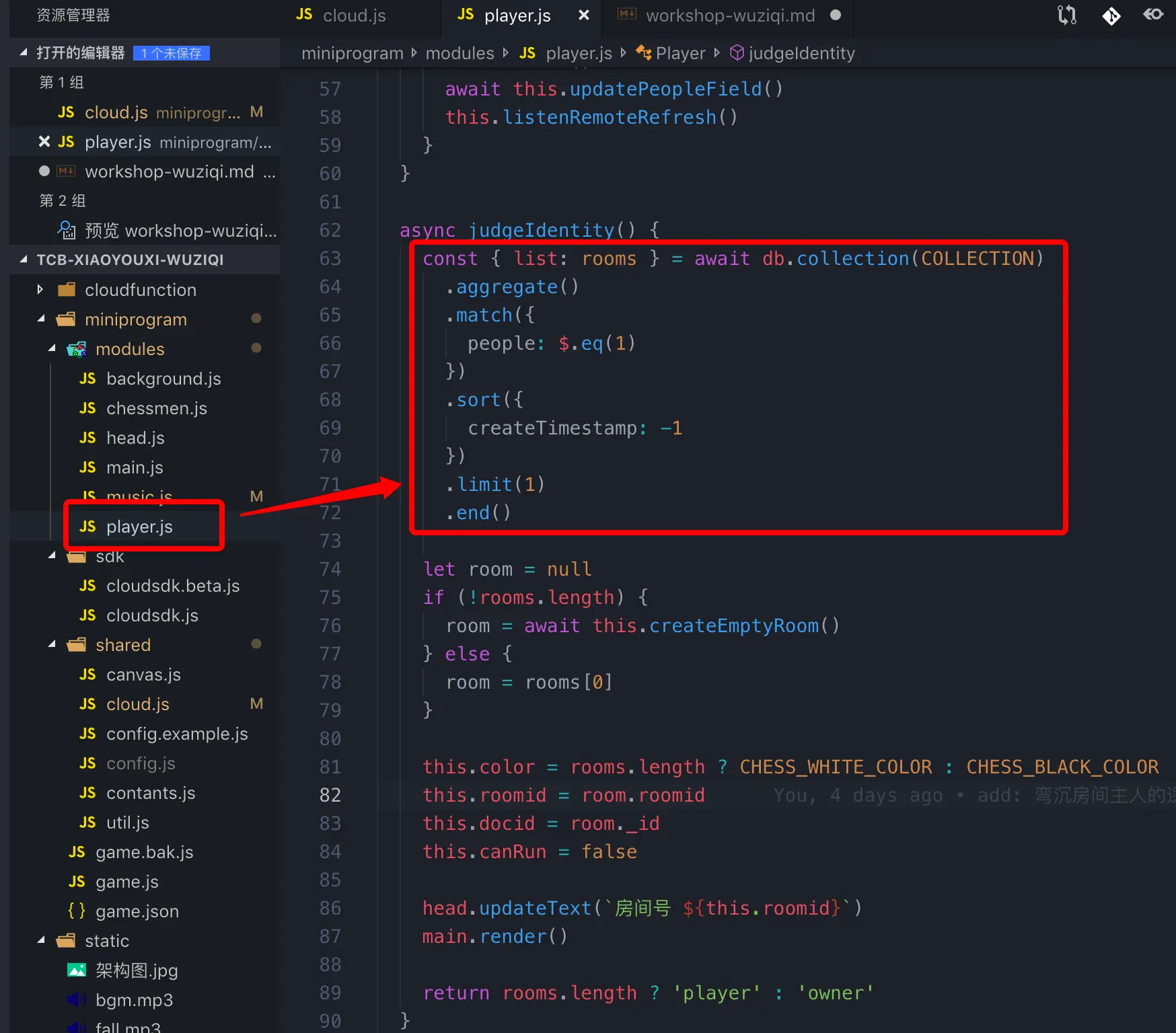 判断的依据就是 judgeIdentity 方法中,读取云数据库集合中的 rooms 的记录。如果存在多个空闲房间,需要选取创建时间最近的一个房间。因此,这里需要用到「聚合搜索」的逻辑。